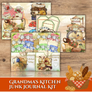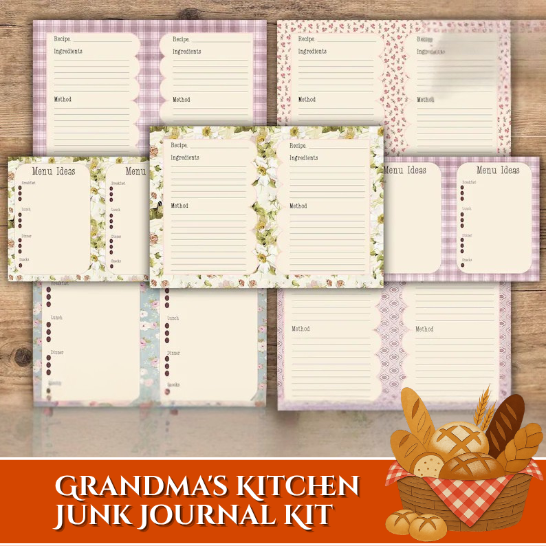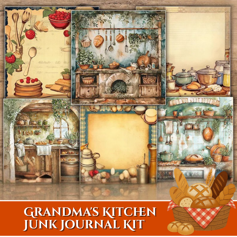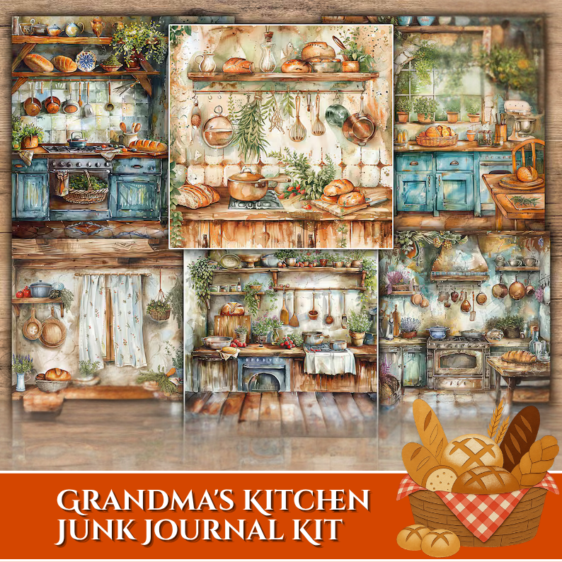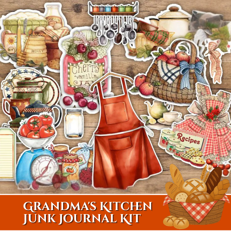 This beautifully illustrated kit features delightful kitchen-themed elements such as cherry jam jars, rustic teapots, fresh produce, woven baskets, baking tools, and a classic apron centerpiece. Designed with soft, warm tones and vintage textures, each piece captures the comforting essence of homemade meals and treasured family traditions.
